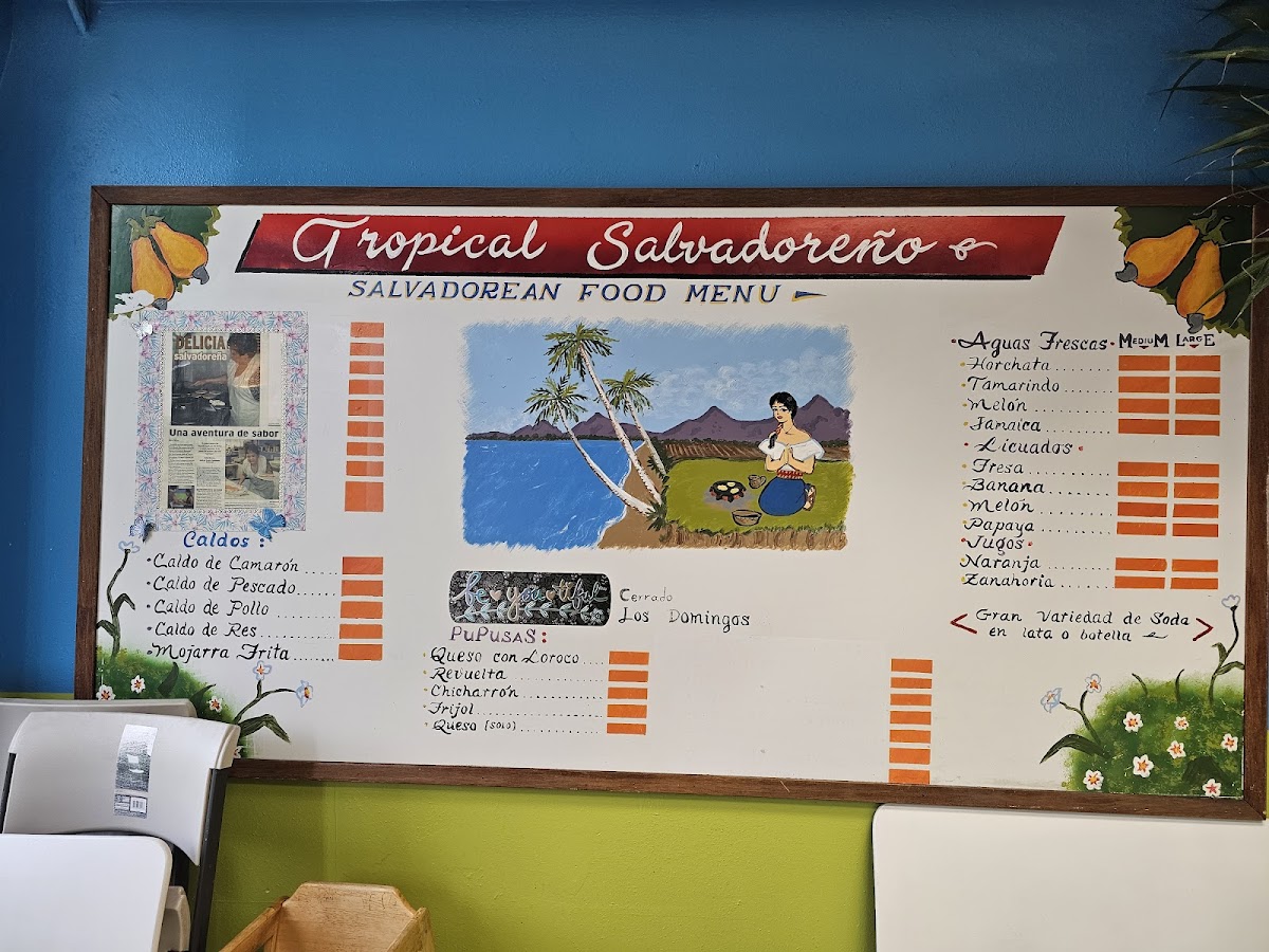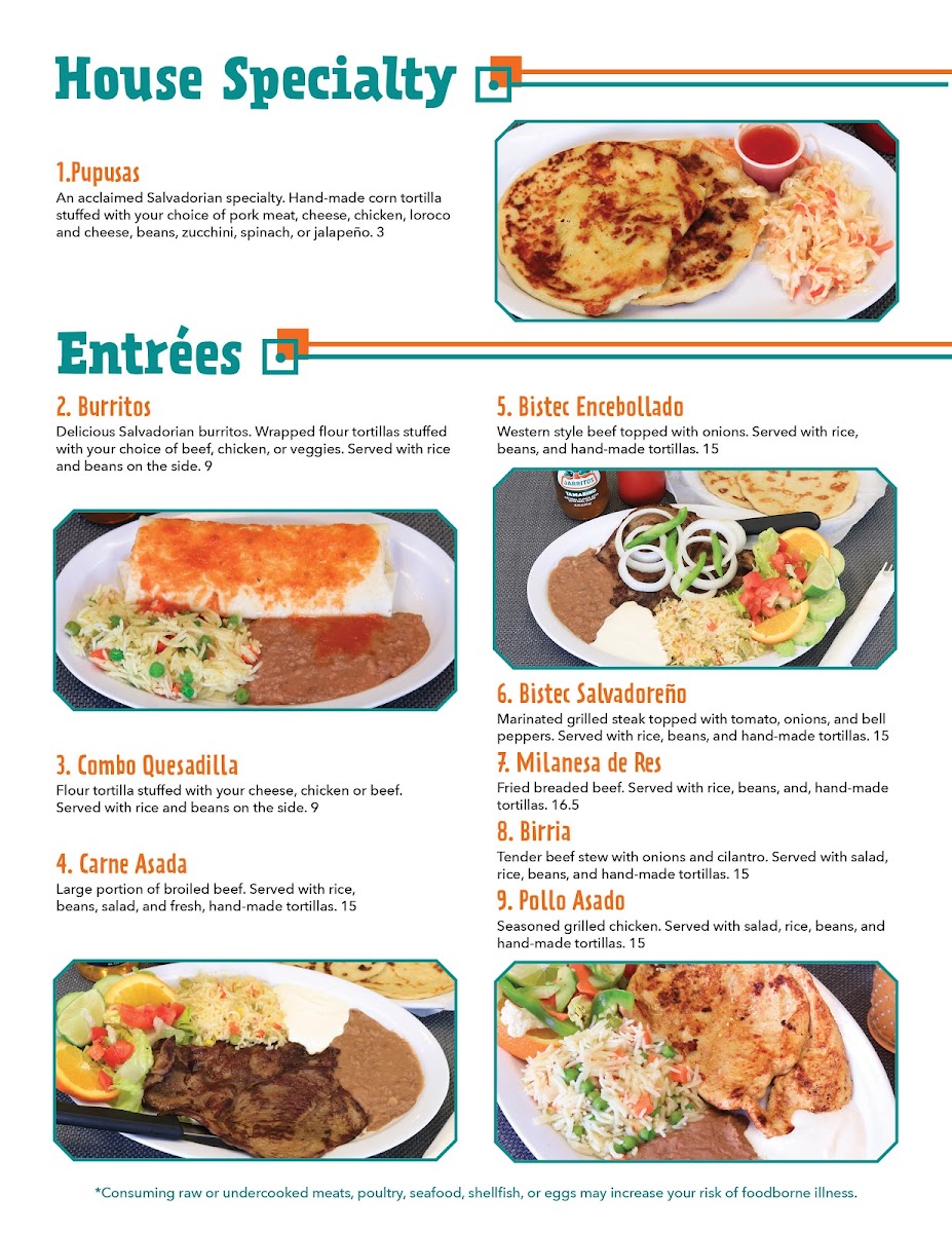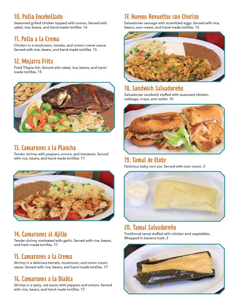 The Tropical Salvadoreño Restaurant Menu offers a vibrant and flavorful journey through the heart of Salvadoran cuisine. From the moment you take a seat, you’ll notice a delightful range of dishes that bring a taste of El Salvador right to your plate. Whether you’re craving a hearty pupusa stuffed with cheese and pork or a fresh, zesty ceviche to kick off your meal, the menu is packed with options to suit every palate. The options are crafted using fresh ingredients, each bite offering a unique combination of textures and spices that reflect the rich culture and traditions of El Salvador. Whether you're enjoying a sizzling carne asada or savoring the comforting warmth of a homemade sopa de mariscos, there's something for everyone. At Tropical Salvadoreño, every dish tells a story, making it more than just a meal - it's an experience.